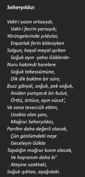 İthaki’de neşredilen bu şiirin tercümesini, ahengi aktaramaması açısından oldukça vasat bulmuştum; Türkçe’ye güvenemeyişlerinden ötürü biraz kızdım ve neden ben tercüme etmiyorum dedim. Çok iyi bir tercüme olmadığına hemfikiriz, tenkitlerinizi samimiyetimle bekliyorum.