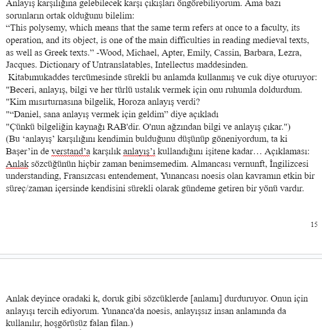 4-Bunu ikinci maddenin bir alt maddesi olarak da verebilirdim fakat ayrıca değinmek istedim. Diyelim bir kelimeyi çevireceğiz fakat ilk bakışta dilimizde çevireceğimiz kelimeye tekabül edebilecek bir karşılık yok gibi gözüküyor. İlk tepkimiz ne olur? Elbette o kelimeyi ya doğrudan almak ya da ona karşılık yeni bir kelime türetmek. Halbuki aceleci olmayıp dilimize şöyle bir filozof bakışıyla baksak aslında kelimeleri işlemek varken acelecilik yüzünden lüzumsuzca pek çok kelime türettiğimizi ve alıntıladığımızı göreceğiz. Örneğin Alm. Verstand’a karşılık türetilen (aslında bu kelime Çağatayca’da varmış) “anlak” kelimesi. Dilimizde anlayış gibi verstand’a mükemmelen uyan bir karşılık varken bu kelimeyi bulup işlemek yerine yeni bir kelimeyi tedavüle sokmaya kalkışmak ne demektir? Tutmuyor işte.